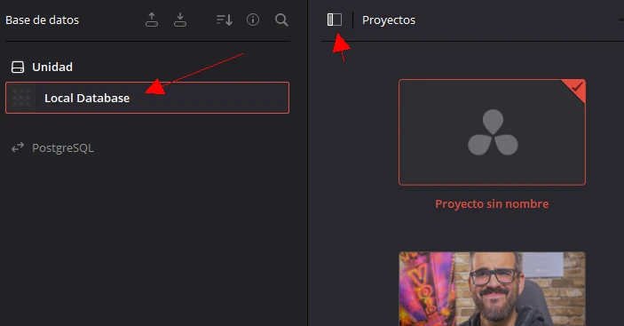 Ahora, localiza la carpeta donde están los proyectos de tu DaVinci Resolve. En la ventana de proyectos, haz clic en el panel lateral, selecciona la base de datos, botón derecho, Abrir ubicación de la carpeta.