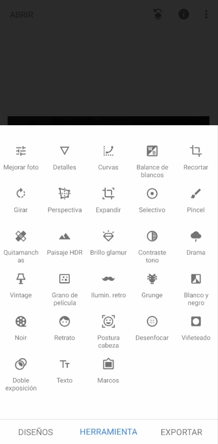 En el apartado Diseño podemos aplicar los consabidos filtros rápidos, aunque el gran meollo de Snapseed es el panel de herramientas, donde encontraremos una enorme variedad de efectos y ajustes que podemos aplicar a nuestras fotos: mejoras en la imagen, corrección de detalles, curvas, recorte y rotación, retoque selectivo, quitamanchas… En fin, un sinfín de posibilidades que podremos aplicar en el orden que queramos. Además, por cada ajuste que apliquemos podremos variar la intensidad con el deslizador que tenemos arriba.