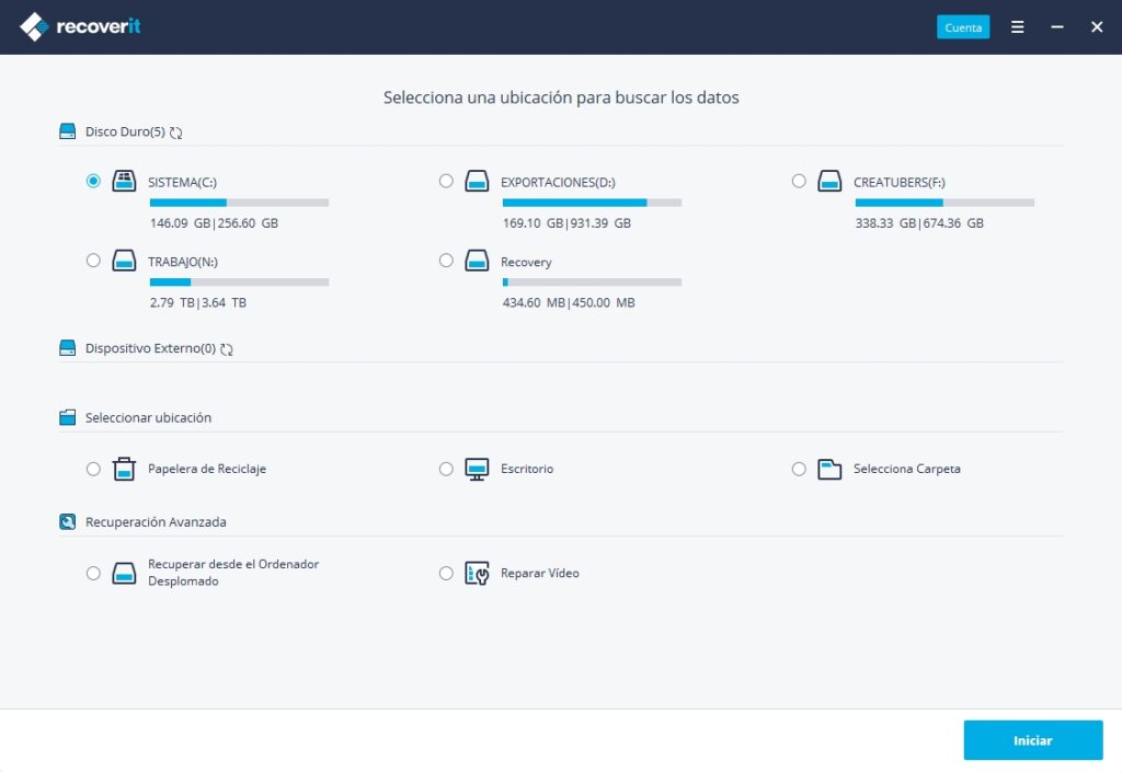Usar Recoverit es muy sencillo. Cuando abres el programa te aparecen las opciones de recuperar datos en un disco duro, dispositivo externo (pendrive o tarjeta de memoria), papelera de reciclaje, una carpeta concreta o vídeo corrupto, este último en caso de que tengas la opción avanzada.