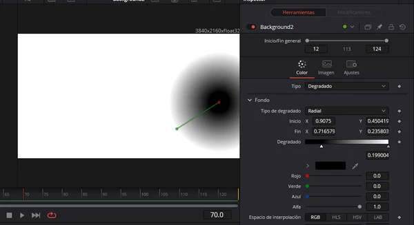Simplemente, crea una composición en Fusion con la imagen como MediaIn (o envía la imagen que quieras a este módulo). Añade un nodo de Background y, en el Inspector, en Tipo elige Degradado. Aplica el degradado de blanco a negro, teniendo en cuenta que el blanco es donde tendrá más presencia este efecto.