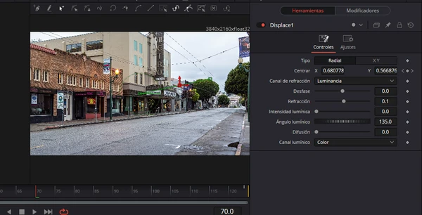 Ahora, en el inspector, si cambias el valor Centrar X e Y, verás cómo se aplica una deformación según el nivel de blanco que tenga ese nodo de fondo. Anima estos parámetros con fotogramas clave y luego combina este efecto con un zoom dinámico en el clip en la página de Edición para destacar este efecto de zoom.