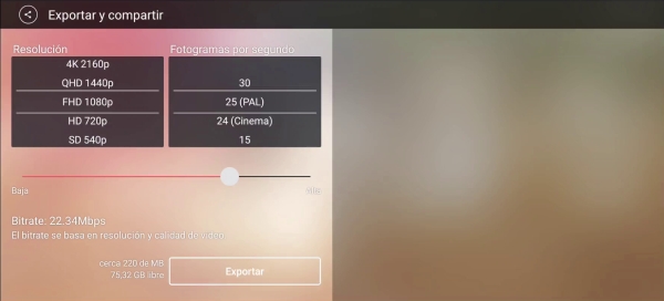 Una vez que estemos contentos con el resultado de nuestro montaje, podemos exportar el proyecto. Para ello, le daremos al botón de exportar de la izquierda (el que está debajo del botón «deshacer») y seleccionaremos la resolución y número de fotogramas por segundo.