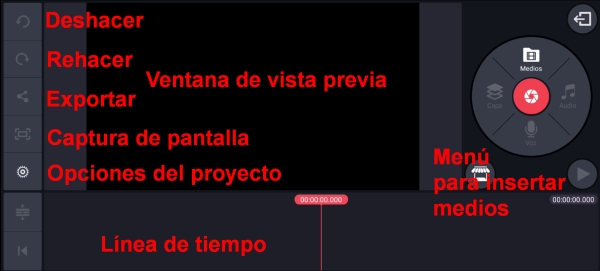 Tenemos la ventana de vista previa, las opciones de deshacer y rehacer, exportar el proyecto, realizar una captura del fotograma que estemos viendo en la vista previa y la ruedecita que es el menú para insertar medios. Fíjate que podemos añadir fotos o vídeos desde nuestra cámara, grabando en directo sobre la marcha.