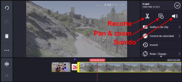 Asimismo, si pulsamos en cada clip veremos una serie de opciones rápidas, como cortar el clip, aplicar paneo y zoom y efectos de audio.