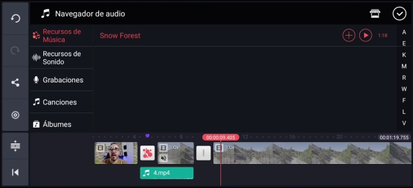 Ya con el primer elemento que seleccionemos se importará a la línea de tiempo. Hay que aclarar que en Kinemaster la línea de tiempo no funciona como en un editor de vídeo de PC. Se asemeja un poco a la línea de tiempo de las versiones antiguas de Filmora, es decir, tenemos el vídeo o vídeos que importemos y luego los elementos que queramos añadir a posteriori no en pistas, sino como «capas».
