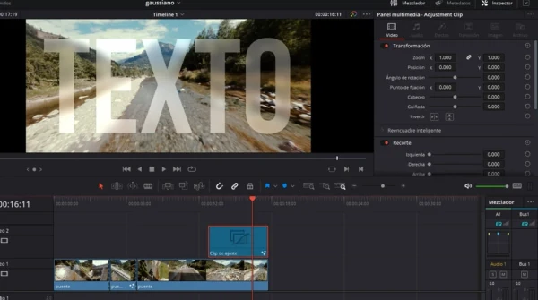 Por último, si lo que quieres es tener disponible este efecto como un clip independiente y reutilizable, solo tienes que copiar los tres nuevos nodos que has generado (el de Desenfoque, el de Mezcla y el de Texto), crear un Clip de Ajuste, abrirlo en Fusion y pegar estos tres nodos entre el MediaIn1 y el Media Out. Este clip de ajuste puedes guardarlo en una Bandeja compartida para reutilizarlo en el proyecto que quieras.