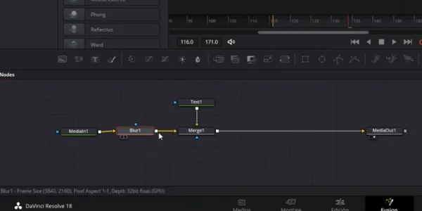 En DaVinci Resolve, selecciona el plano que quieras y realiza dos cortes para delimitar el área que cubrirá ese texto. Abre ese clip en Fusion y crea un nodo de Desenfoque unido al MediaIn1 (la imagen original). Luego, crea un nodo de texto y únelo a la salida del nodo de Desenfoque. Se creará un nodo de Fusion (los anteriormente conocidos como «nodos de Mezcla»).