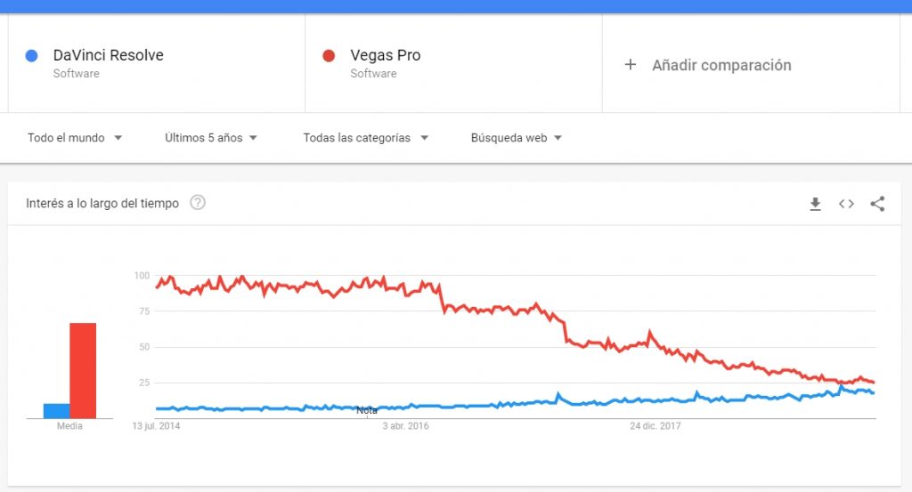 Sin embargo, también quise darle una oportunidad a un programa que aún tenía una cuota de mercado residual, pero que empezaba a añadir características muy atractivas para editar vídeo. Tenía muchas ilusiones puestas en el curso, pero esperaba que fuese más discreto en ventas. Si echamos un vistazo a mi amigo Google Trends vemos que el interés por Vegas Pro es superior al de DaVinci Resolve.