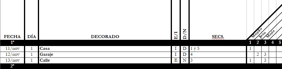 Aquí vamos a indicar todos y cada uno de los elementos que están involucrados en el rodaje del día siguiente: personajes, localizaciones, meteorología, etc.
