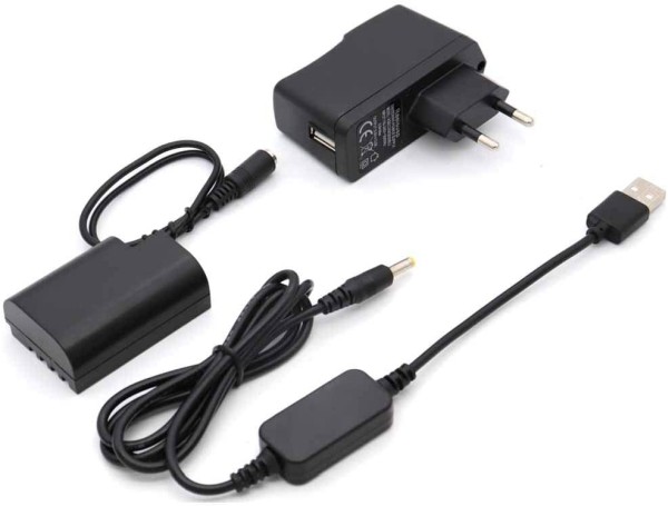 La tercera ayuda a mi juicio es la más importante. Los he encontrado con miles de nombres diferentes: dummy battery, batería simulada, adaptador, fuente de alimentación, etcétera. Pero básicamente consiste en una batería fake, de mentira, que tiene un cable. Fíjate que tu cámara tiene una muesca o lengüeta o agujero en la puertecita del compartimento de la batería. ¿Nunca te has preguntado para qué sirve?